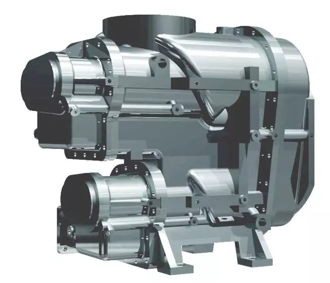 - 雙電機獨立驅動,每級壓縮比相比單級壓縮降低,轉子間泄漏回流大大降低,產氣量增加;